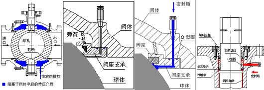 固定球閥采用彈簧預(yù)緊浮動(dòng)閥座,無論閥門處于全開或全關(guān)狀態(tài)時(shí),上下游側(cè)的閥座使流體阻斷,閥體中腔滯留物通過排放閥排泄。