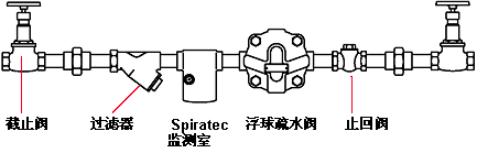 ●對(duì)于非直接排向大氣的系統(tǒng),在疏水閥的上游應(yīng)安裝Spiratec檢測(cè)裝置以便于監(jiān)測(cè)和及時(shí)發(fā)現(xiàn)疏水閥失靈或設(shè)備積水情況。有些情況下在疏水閥下游安裝觀(guān)視鏡來(lái)代替Spiratec檢測(cè)裝置。如安裝觀(guān)視鏡應(yīng)安裝于離噴排式疏水閥(如熱動(dòng)力疏水閥)下游至少一米處。