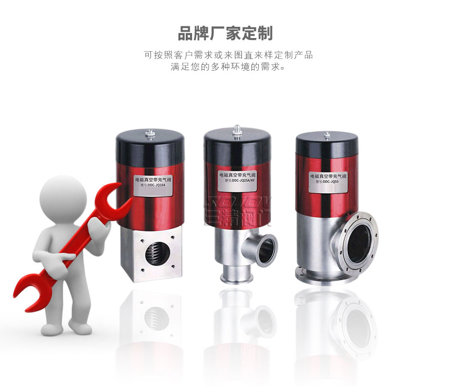 DDC-JQ electro-vacuum charging valve is a safety valve for vacuum, pump. It is mounted at the intake nozzle of vacuum pump, synchronously opened and closed with the vacuum pump. In case that vacuum pump stops working or power supply is suddenly broken off, valve will be cosed automatically to keep the vacuum system vacuum and the air charged into the cavity of vacuum pump, thus to prevent pump oil from reverse flow that can pollute the vacuum system. Applicable medium can be pure air and noncorrosive gases.
